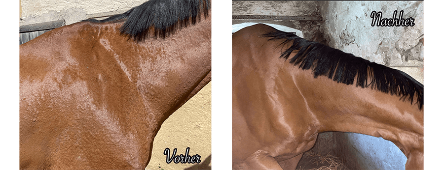 Natascha Rumetshofer (Springreiterin) ist, wie alle unsere Kunden, sehr begeistert von unseren Produkten und hat uns auch Fotos geschickt, die die wohltuende Wirkung vor und nach der Behandlung mit unseren Hippo antiMuck-Produkten zeigen.